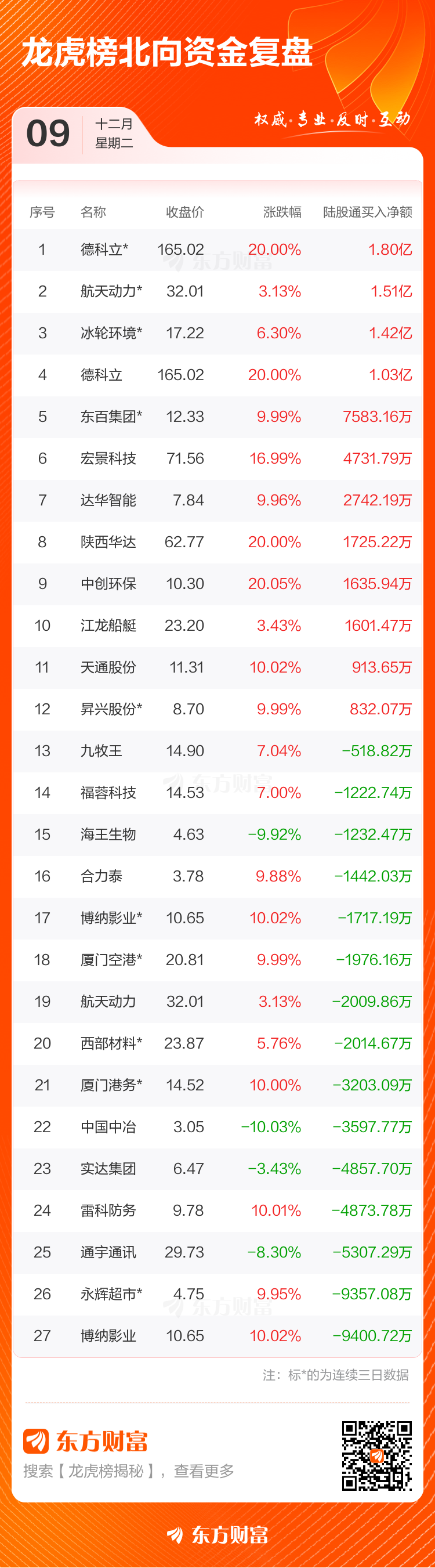 12月9日共有63只个股上榜龙虎榜,总上榜成交额188.30亿元。上榜个股中净买入额最高的是德科立,金额为4.67亿元。