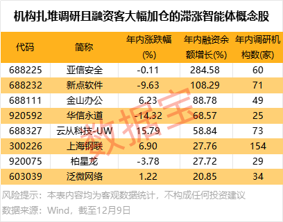 最新融资余额较去年末增超20%且年内股价涨幅低于25%(跑输智能体概念指数年内整体涨幅),年内获得20家以上机构调研的概念股仅有8只。其中,上海钢联、云从科技-UW、新点软件年内机构调研家数居前。
